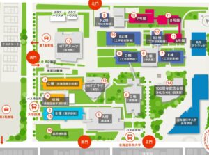 広いので気がつかないと思いますが、上から見ると高校の校舎は、とてもユニークな形をしています。(右下の青い建物)